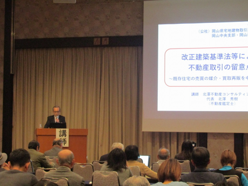 令和7年11月18日、岡山中央支部・岡山西支部合同研修会が開催されました。講師に北澤不動産コンサルティング代表の北澤秀樹氏(不動産鑑定士)をお招きし、「改正建築基準法等による不動産取引の留意点」と題して、既存住宅の媒介・買取再販実務への影響についてご講演いただきました。出席者はオンラインで172名、岡山プラザホテルで55名、合計227名でした。
