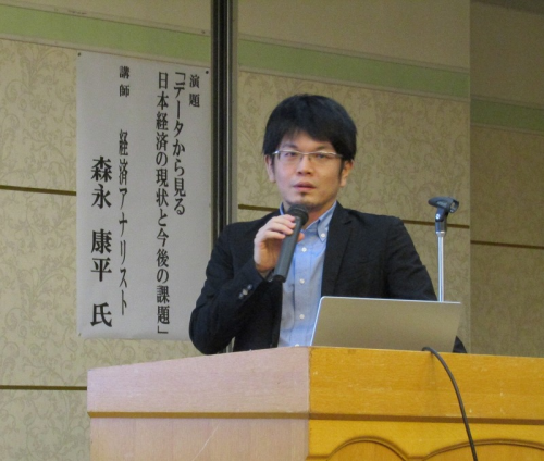今回の演題は「データから見る日本経済の現状と今後の課題」として、テレビやラジオ、ユーチューブでご活躍され、最近は総合格闘技デビューも果たした経済アナリストの森永康平氏を講師としてお招きし、ご講演頂きました。森永康平氏のお父様はテレビやラジオで有名な森永卓郎氏です。