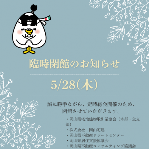 令和8年5月28日(木)は定時総会のため、本部・全支部・株式会社岡山宅建・(一社)岡山県不動産サポートセンター事務局・岡山県居住支援協議会事務局は閉館いたします。